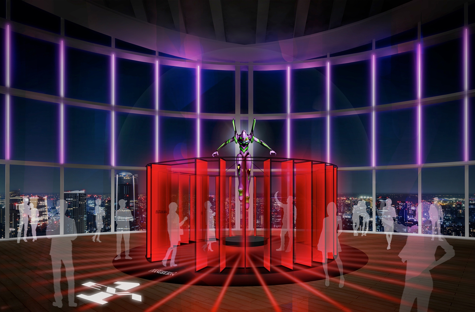 六本木ヒルズ森タワー52 階に位置し、東京タワーや東京湾などの絶景を望む会場エントランスには、重厚感あふれるエヴァンゲリオン初号機フィギュアが登場。日没後は東京会場限定の照明演出で、30周年の「祝祭」を華やかに彩ります。